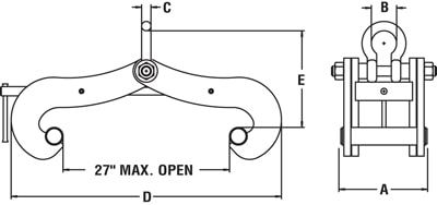 | Model Number | Rated Capacity (tons) | Flange Width Min. – Max. (in.) | Max. Flange Thickness (in.) | A (in.) | B (in.) | C (in.) | D Min. – Max. (in.) | E Min. – Max. (in.) | Weight (lbs.) |