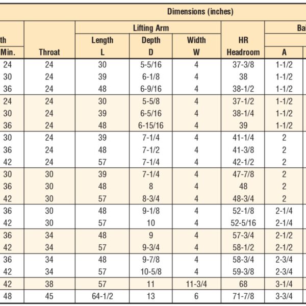 Model Number Capacity (tons) Max Width (in.) Min Width (in.) Throat L (in.) D (in.) W (in.) HR (in.) A (in.) B (in.) C (in.) T (in.) Weight (lbs)