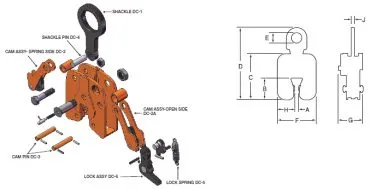 | Model | Rated Capacity ( Tons ) | Plate Thickness A ( in. ) | B ( in. ) | MAX C. ( in. ) | D ( in. ) | E ( in. ) | F ( in. ) | G ( in. ) | H ( in. ) | J ( in. ) | Weight ( lbs. ) |