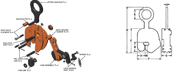 The Model TLA is a vertical lifting clamp incorporating a “Lock Open” and a “Lock Closed” feature and an auxiliary lock.