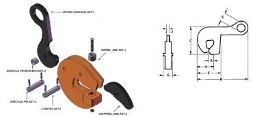 The horizontal shackle permits a beam to be lifted with the web in a near horizontal position by placing the clamp on the load with the shackle positioned over the web, and between the flanges. With a beam lying in a horizontal position, and the clamp placed with the shackle overhanging the flange, the beam can be lifted, turned 90 degrees, and raised in a vertical position.